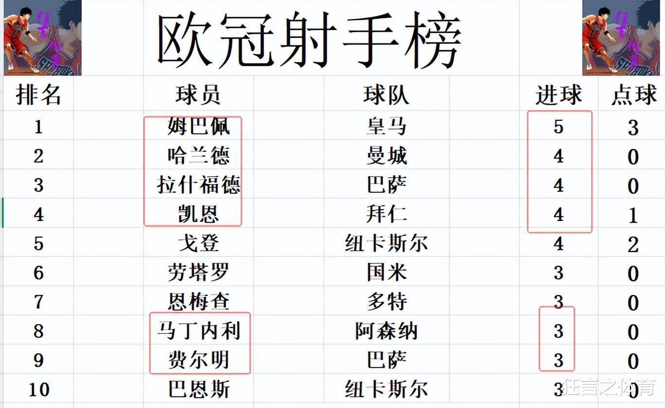 射手榜方面,姆巴佩以5粒进球继续稳居榜首。哈兰德和戈登的进球,以及拉什福德的梅开二度,让他们追平了凯恩,三人均以4粒进球并列射手榜第二位。费尔明上演帽子戏法,加上劳塔罗、恩梅查和马丁内利等球员的出色发挥,将射手榜前十的门槛提高到了3粒进球。